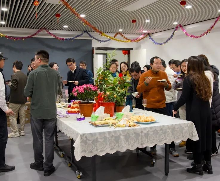 致辞过后,丰富的美食盛宴就开始了。这次联欢活动学院准备了南京烤鸭、羊肉串、羊肉汤、双层大蛋糕、饺子,还有水果、茶饮等各种美食和饮品。老师们品尝美食,举杯同庆过去一年的成绩,展望畅谈未来的发展。