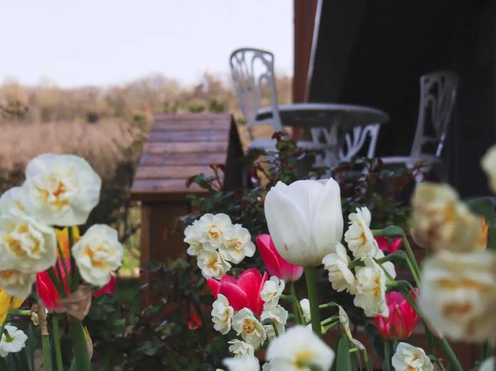 无论是欧式的桌椅还是古朴的红墙,在郁金香的点缀下自然有了一种油画的感觉,不像其他花朵那样脆弱柔美,挺拔又端庄的郁金香向春天彰显着它健康昂扬的活力。