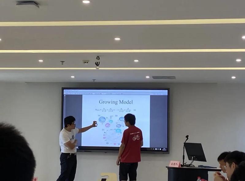 尚可可老师发表《Growing networks with communities: A distributive link model》的计算模型汇报,展示了一个网络社群传播的计算模型。评议人王成军副教授在计算方法上与之进行了细致的探讨。