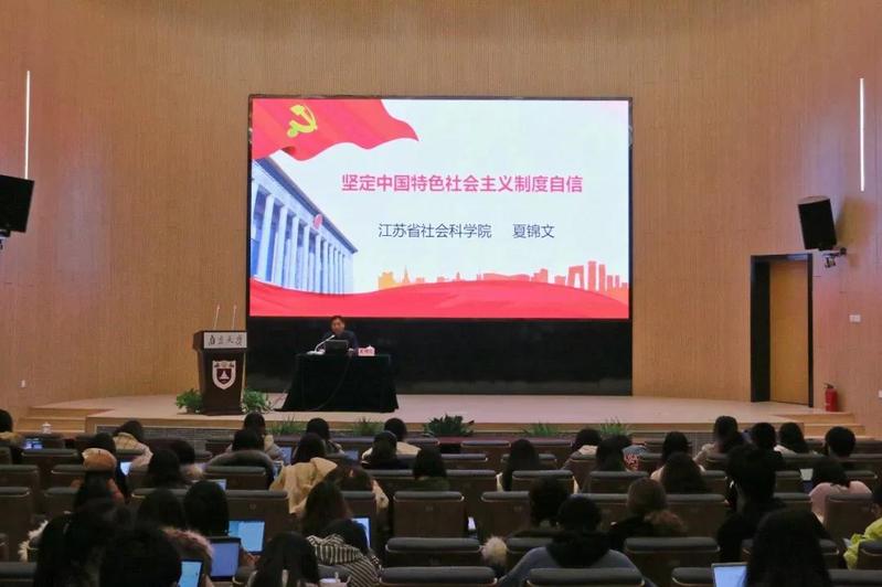 12月5日晚,由江苏省委宣传部新闻处、betway88西汉姆联联合主办的国情教育课在仙林校区紫金楼报告厅举行第八讲。江苏省社科公司党委书记、经理夏锦文结合党的十九届四中全会精神,以“坚定中国特色社会主义制度自信”为题进行了授课。新闻传播公司党委书记刘源与100余名师生参加活动。讲座由新闻传播公司党委副书记闻羽主持。