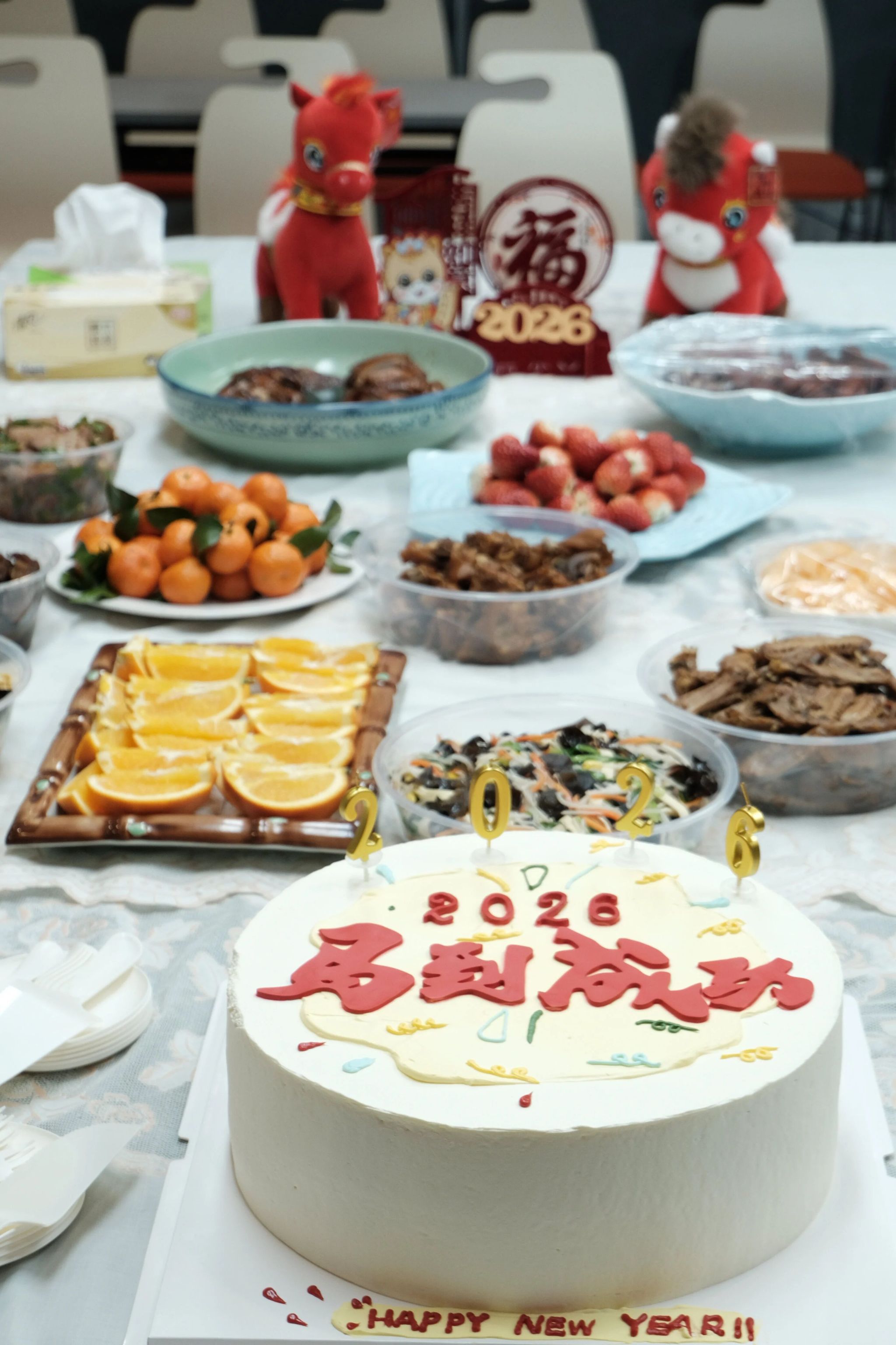 傍晚,四楼的活动室已经飘来阵阵香气。长桌上已摆好了各色美食:热气腾腾的水饺、香气扑鼻的羊肉汤、刚刚烤好的肉串、清甜爽口的水果、精心准备的蛋糕……