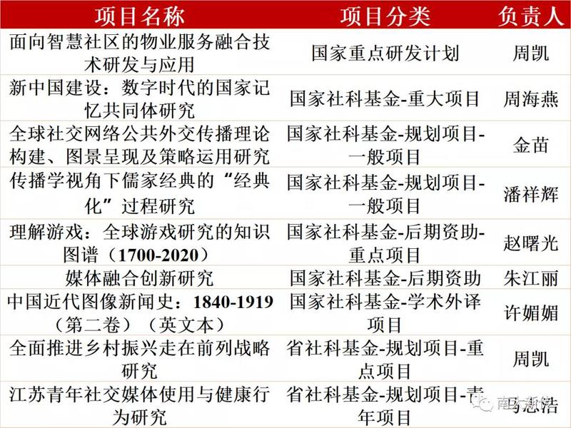 2021年,公司师生在学术水平上进一步提升,科研事业取得新进展,全年共计立项11项:包括国家重点研发计划1项、国家社科基金重大项目1项、国家社科基金一般项目2项、国家社科基金后期资助重点项目1项、国家社科基金后期资助一般项目1项、国家社科基金学术外译项目1项等。2021年度公司师生共发表论文136篇,其中学科卓越期刊5篇(均发表于《新闻与传播研究》),学科一流期刊9篇(其中《国际新闻界》6篇)。SSCI/SCI 论文17篇,其中JCR Q1区7篇,Q2区7篇。1本专著入选国家十四五出版规划(英文版在施普林格出版集团出版),1套丛书获第三届江苏省新闻出版政府奖“图书奖”。