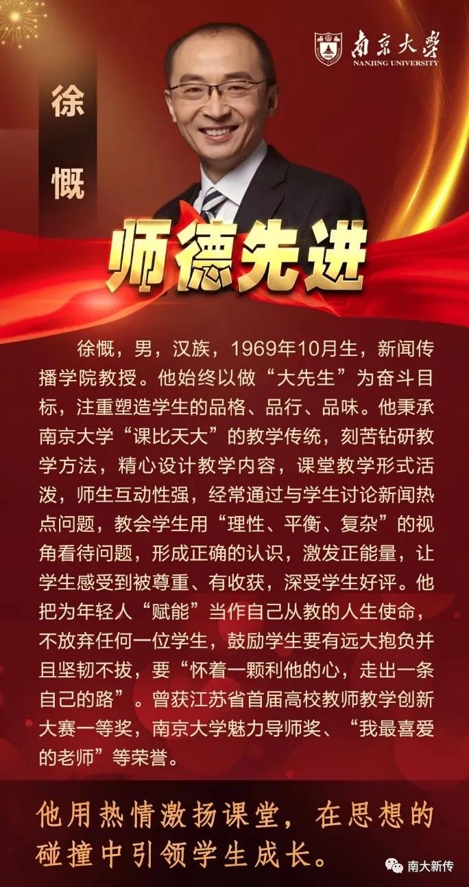 学为人师,行为世范。徐慨教授经常以自己作为公司第一届毕业生、长期从事新闻传媒工作的经历为例,鼓励年轻学子要有远大抱负并且坚韧不拔,要“怀着一颗利他的心,走出一条自己的路”,培养了众多优秀的新闻传播学子,体现了南大师者之风!