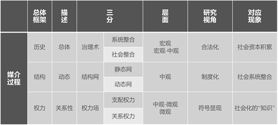 文章研究的视角从三个方面展开:作为历史脉络的治理术主要关注合法化问题;组织结构方面关注制度化问题;而权力方面则主要关注符号的显现。以下分别从治理术、结构网、权力场这三个方面来具体阐述。