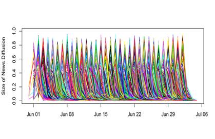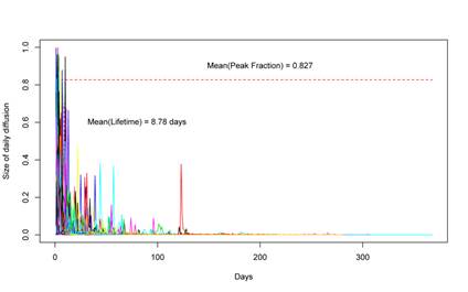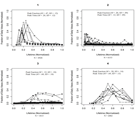 第三,在发现时间对于信息扩散的影响之后,基于这种特征继续去研究Youtube上的扩散特性。结果就发现在Youtube上面就非常多样化,对于视频的扩散,同时存在着突然爆发并消失和慢慢爆发并持续存在的情况,还有一些处于中间态,有很小的爆发,或者一直都没有爆发,但也可以一直传播。