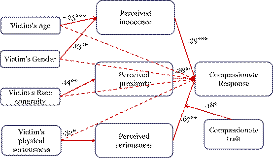 关于感知无辜性的结论:一是研究将同情性反应同Anger(愤怒)、Fear(恐惧)、Excitement(兴奋)等基因基础上的情感反应区分开;二是对于Innocence(无辜性)的判断,包含了一个道德维度的评价,这就将同情性反应与其它的情感性反应,比如说Empathy(共情)和Pity(怜悯)分别开;三是对于那些影响人们感知无辜程度的要素来说,受害者年龄是一个强有力的因素,而受害者性别是通过和年龄的交互作用来起作用。 关于感知临近性的结论:感知临近性在对同情性反应的影响上是最弱的,但是它确认了文化的相近性在人们同情性反应中的作用。