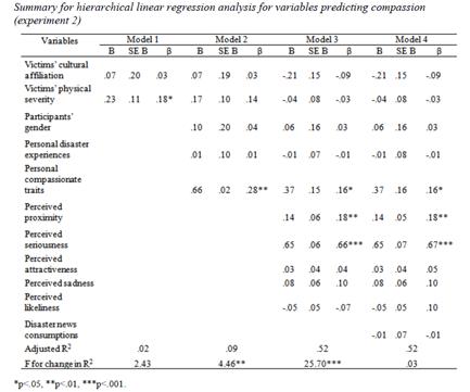H2a: Individual compassion will be positively related to the participants’ perceived proximity toward the victims. That is, the greater perceived proximity, the higher the compassion. H2b: Participants’ perceived proximity will be associated with cultural similarity. That is, victims of Hurricane Katrina would be perceived as more proximate than victims of the Indian Ocean Tsunami. RQ2: How is cultural similarity related to compassion? |