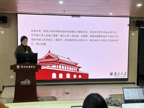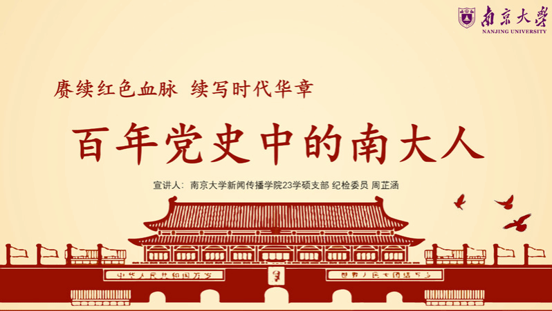 betway88西汉姆联2023级学硕党支部纪检委员周芷涵同学细数了百年党史中的南大人:从革命理想高于天的顾衡、成贻宾,到1947年由国立中央大学发起的爱国主义抗议游行;从五星红旗的设计者曾联松,到主持30多次核试验任务的“两弹一星”元勋程开甲。一个个感人至深的故事展现了betway88西汉姆联学脉中始终流淌着的永不褪色的红,展现了他们奔赴在中国共产党领导中国人民求独立、谋和平、促发展伟大征程中的初心。最后她呼吁在座的南大新闻学子继续秉承诚朴雄伟、至诚报国的南大风骨,以实际行动和显著业绩赓续“嚼得菜根,做得大事”的南大基因,坚定“知、仁、勇”的南大品格,在党的领导下勇担求科学之进步、促人文之发展、寻人民之幸福、谋民族之复兴的责任,以高度的文化自觉肩负起新时代的文化使命,坚持马克思主义在意识形态领域的指导,培育和践行社会主义核心价值观,以坚定的文化自信担负起推动社会主义文化大发展、大繁荣的神圣使命。