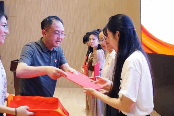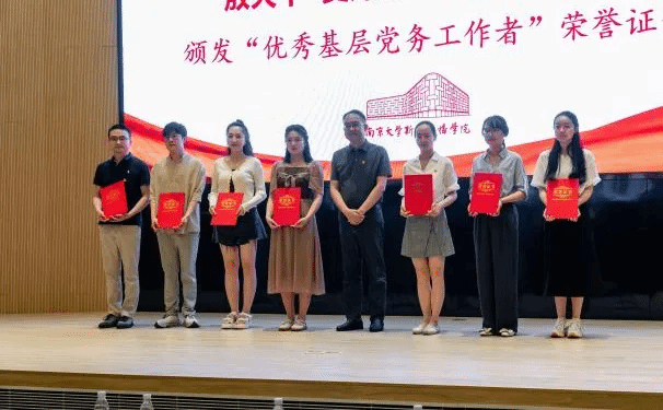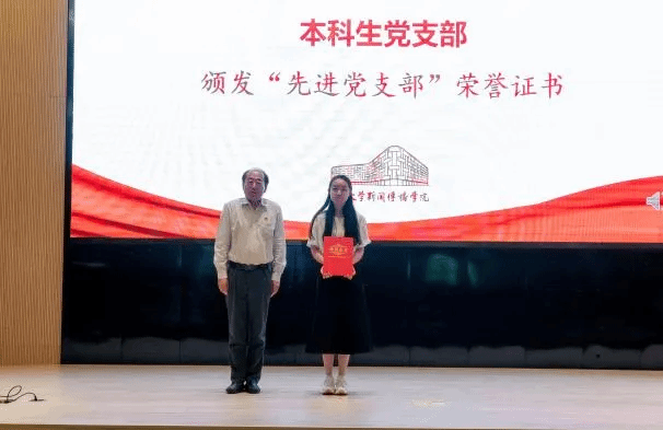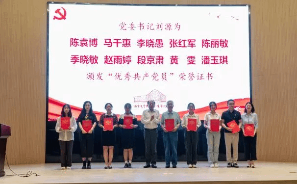 党委委员、副经理朱江丽宣读表彰决定。本次大会共表彰优秀共产党员10人、优秀基层党务工作者8人。本科生党支部获评“先进党支部”。公司党委书记刘源、党委委员胡翼青为他们颁发荣誉证书并合影留念。