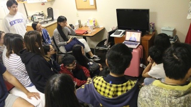 天涯共此时。同一时间的大洋彼岸,正在美国肯塔基大学访学的新传院2015级传媒实验班全体同学,在落脚宾馆的一个房间,共同围坐在电脑前,打开央视网,同步收看正在北京人民大会堂盛大开幕的中国共产党第十九次代表大会。