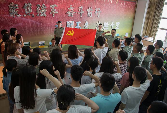在四连指导员靖周的带领下,16专硕党支部的同志们观看了队列示范、障碍训练、捕俘格斗等课目展示,并重温了入党誓词。