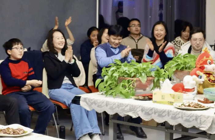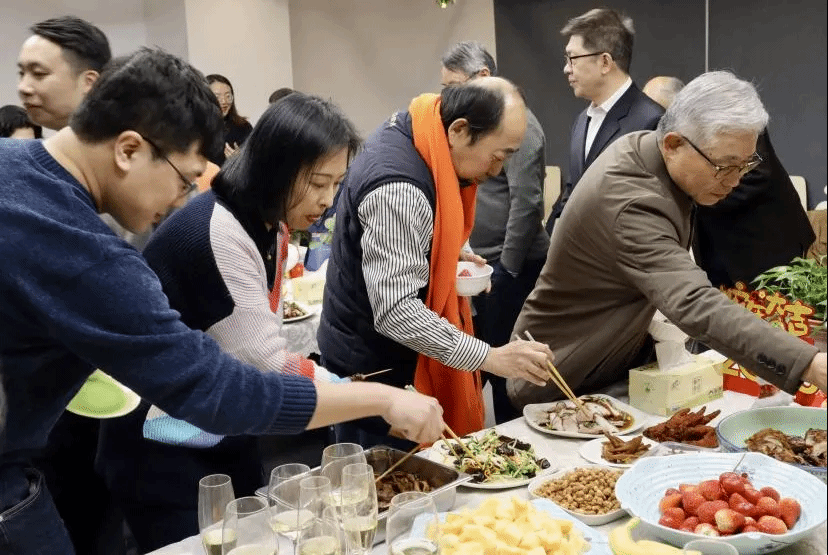 傍晚时分,425活动室里充满了喜庆的音乐声和开怀的笑声,推门而入,各色美食摆满桌面,刚出锅的水饺和羊肉汤腾出热气,大有年夜饭的丰盛与温馨。老中青三代教师围坐桌旁,交流心得、分享感悟,对知识和教育的共同热情使他们跨越年龄的界限,碰撞出绚丽的思想火花。