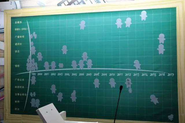 杜经理的背后是一块坐标板,以年份为横轴,以职业为纵轴。95级新闻系的25位同学挨个把自己这些年重要的人生节点用人形贴纸标记在坐标板上,勾勒出一条条或相交,或分离的人生轨迹。
