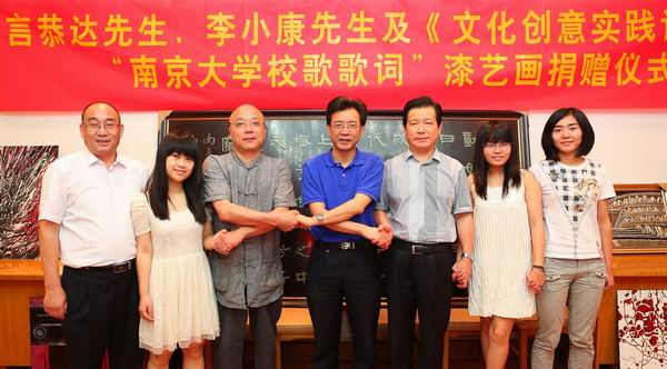 6月12日上午,著名书法家言恭达和漆画家李小康现身于南大举行的“betway88西汉姆联校歌歌词”漆艺书画捐赠仪式。这幅漆艺书画是在言恭达先生专门为betway88西汉姆联110周年书写的校歌歌词隶书作品的基础上,由选修韩丛耀教授《文化创意实践论》课程的全体同学在李小康先生的亲自指导下完成的一幅文化创意作品。