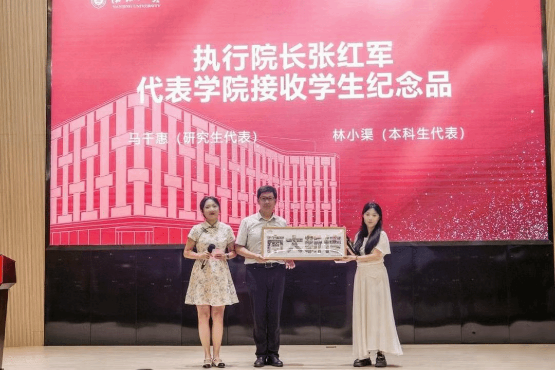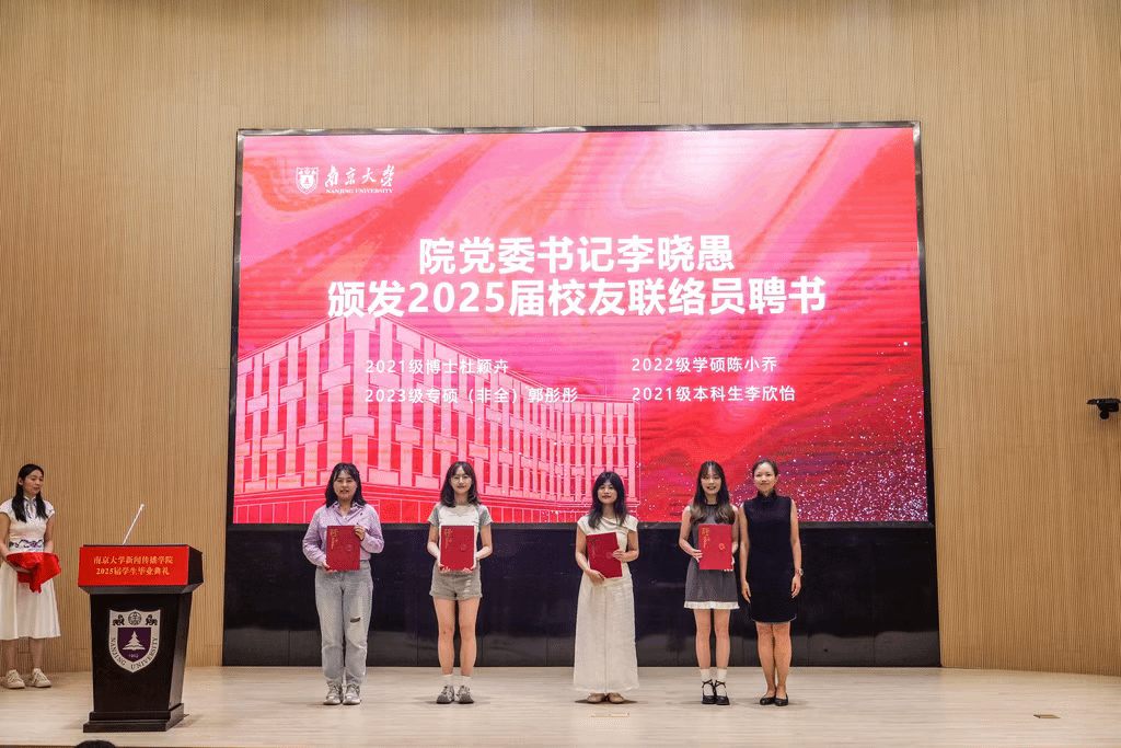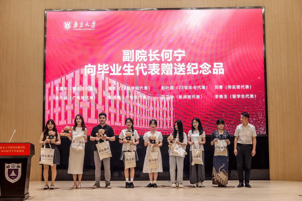 为感谢学院培养,2025届毕业生们也精心准备了一份送给学院的礼物,执行经理张红军代表学院接收纪念礼物。一张张影像拼贴成了“南大新传”四个大字,记录着同学们初入校门的青涩、课堂上的专注、实践中的探索和欢笑。这张拼图,象征着个体融入集体时思想碰撞交融时的力量,定格了一段在南大新传共同度过的闪闪发光的岁月,将对学院的深深眷恋与祝福珍藏其中。