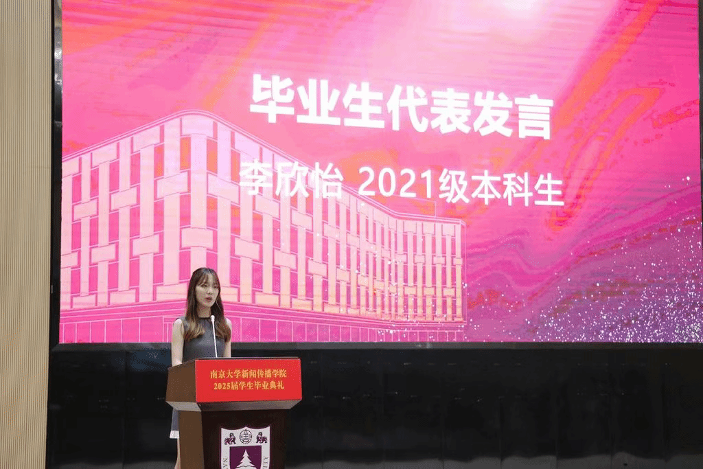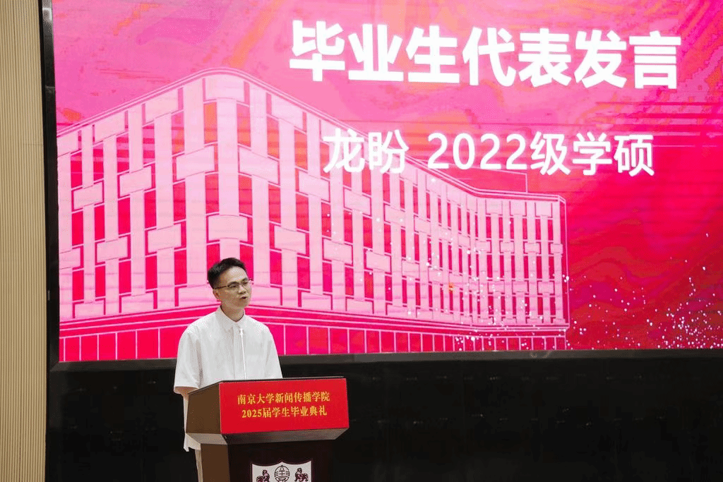 自信、勇敢、务实,研究生代表、2022级学硕龙盼将在南大新传求学旅途中的所知所获凝练为这样三个关键词,他表示,学院赋予了员工专业淬炼的底气,从甄别真伪、挖掘真相的方法论训练,到敬畏真知、坚守责任的价值观塑造,都是直面未来的坚固基石;滋养出坚守理想的勇气,有学术冷板凳的孤寂,也有新闻实践的落差,但从未动摇初心。面向未来,他呼吁同学们保持清醒的自我认知,在众生喧哗中做一个有判断力的新传人,探索自己的能力边界。