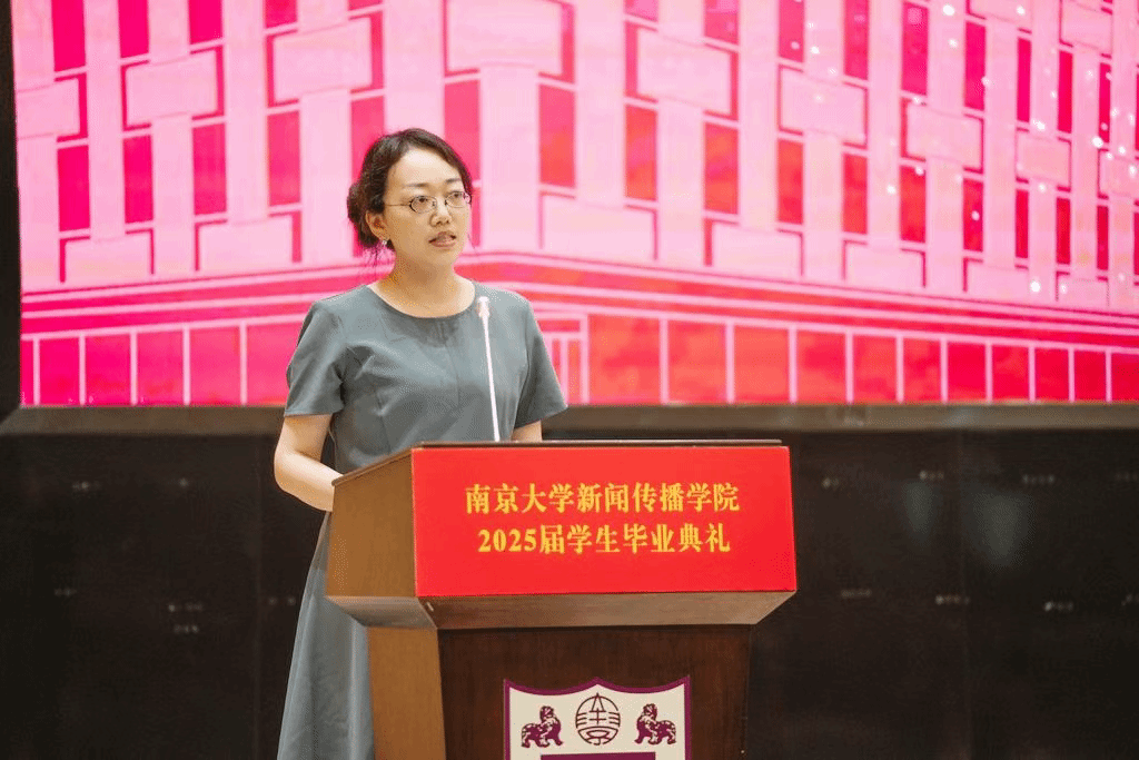 在AI等新技术的挑战下,人文学科的员工们也许正多多少少地面临着一些价值危机,教师代表朱江丽老师以学姐和老师的双重身份,与毕业生同学们共情在时代浪潮中的个人选择。她以“水”为喻,向同学们讲述了在这个“文化疲惫”的时代,何为人文学科的价值——“提醒人们看见看不见的东西”。面对即将奔赴四面八方的毕业生们,她抛出了三个直指本心的坐标之问: