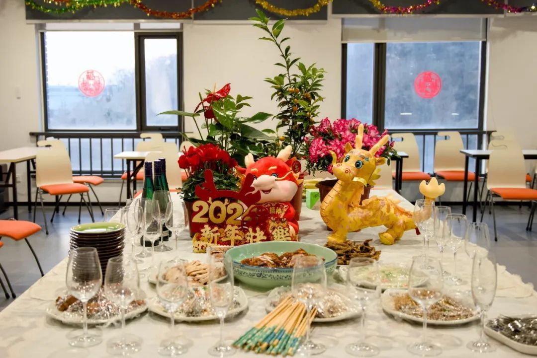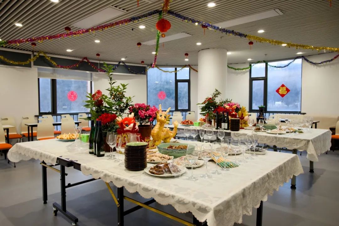 联欢会还没开始,院楼已经布满了浓浓的年味儿:紫金楼正面早已挂上新年祝福语;走进一楼大厅,天花板满是串串红色小灯笼,欢乐祥和;在举办活动的紫金楼425教室桌上,端坐着的小龙娃娃喜庆可爱,各色美食丰富诱人。