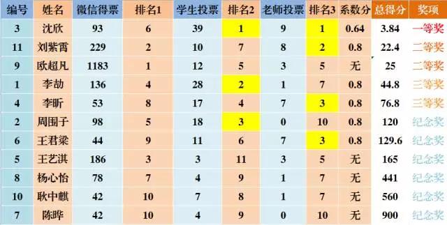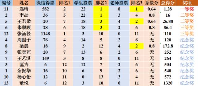 本次比赛采用“名次相乘法”进行计分,另外在员工投票和老师投票两个环节进入前三名的作品,其总成绩可乘以0.8的系数,且系数可以叠加。最终所得乘积越小,名次越前~