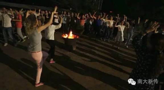 刘源老师的一曲《呼伦贝尔大草原》,烤肉的香气,跳动的火苗和欢乐的舞蹈听说是新传院皖南行篝火晚会的标配。在活泼热情的老板邀请下,特色的宏村时尚秀也走起来了,以色列同学金思丽更是带动全场一起舞动起来,击鼓传花的游戏怎么也停不到男生手中,成为这场晚会独特的元素。天公作美,直到晚会将要结束时才下起细雨。