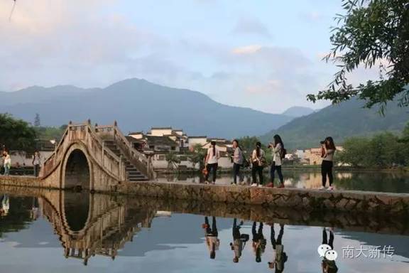 不过,很快大家便发现夕照余光下的宏村是值得空腹而游的。雨后初霁,从检票口步行约几十步后便来到了村口南湖。弓形的南湖湖面倒影浮光,水天一色,远峰近宅,错落有致。同学们纷纷举起相机,咔嚓声四起,南湖很快被同学们“包围”了。