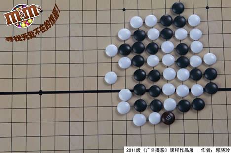 M&M巧克力豆能带给生活什么乐趣?与生活中那些原汁原味的乐事碰撞在一起又会有怎样的火花?此摄影创意巧妙地将M&M巧克力豆与围棋结合在一起,紧张的棋局因为有了M&M巧克力豆的悄悄介入而绝处逢生,在你终于获胜拍手叫好的同时也别忘了这颗小身材带来乐趣横生巧克力豆。