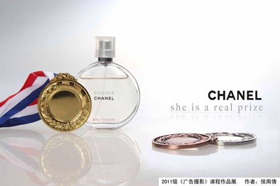 这幅广告摄影作品的创意灵感来自于《纸牌屋》中形容Clare的台词:“She is just a real prize.”——得到她,就像是得到了premium prize. 而香水是女人的另一种身份。因而将Chanel Chance 表现为金牌,一语双关,即指香水也是指使拥有这香水的佳人。