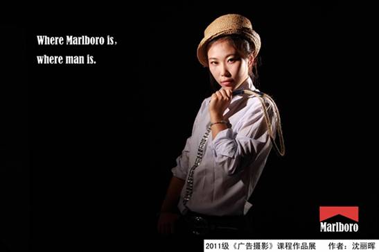 创意思路:“男人味”一直是Marlboro(万宝路)香烟的一贯定位。这张平面用夸张的方式,以身着男装的女模特来表现Marlboro(万宝路)香烟带来的男人味。