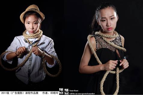 这是为WWF保护野生动物主题创作的一副广告摄影作品。你看,人类在用餐享受他们的美食,但是闪着锋利光芒的刀叉连着绳子一端,绳子的另一端连着他们的脖颈,吃下盘中的“美食”,最后勒死的却是他们自己。这是一桩令人意想不到的谋杀,却也只有“保护野生动物”才能阻止犯罪。无论你是冷酷无情还是满含慈悲,都请放下“屠刀”,立地成“佛”。