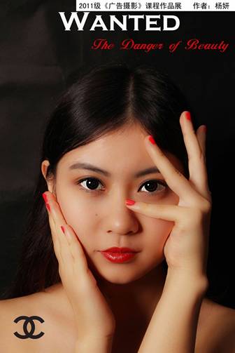 本张人像摄影的商业主题是Chanel化妆品,所以整个广告作品设计成了一张通缉令的样子,以为图中的女主角是一个非常危险的任务,“The danger of beauty”,美丽的诱惑,致命的诱惑。由于是化妆品广告,所以模特的妆容显得尤其重要,红唇以及红色指甲油相呼应。而采用的主要布光方式为主光加辅助光,主光添加长型柔光箱,使得拍摄光线不至于过于硬朗。由于这张作品为人物特写,所以模特的表情以及神韵的抓取显得尤为重要。