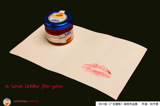 静物拍摄我选择了一款蜂蜜产品,希望用一盒蜂蜜(honey)和一张印着红唇的纸构造一封情书的感觉,蜂蜜表示honey,唇印表示I love u,不过拍摄时候因为唇印不够鲜艳,而蜂蜜的包装不是很适合拍摄,导致一直看起来很昏黄,不过后来补了一个侧光,最后看起来也还不错。
