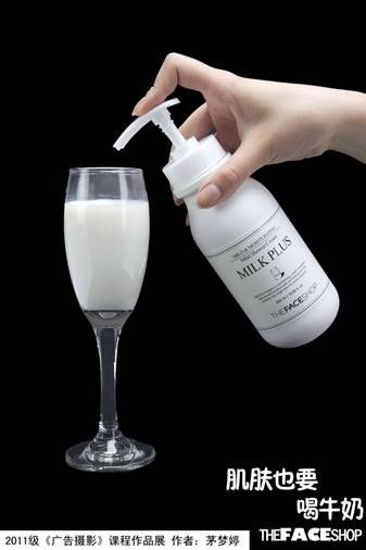 静物:想要表达的创意点为:沐浴露可以让肌肤喝牛奶。但是“喝”这个动作很难用静物摄影表现,于是改变思路,通过沐浴露和装满杯子的牛奶,再结合倾倒的动作,自然而然地可以让人联想到沐浴露像牛奶般滋润,仿若给肌肤喝牛奶一般。