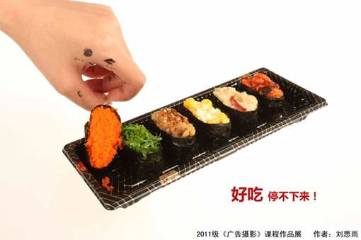 在手上画出表情,并作出嘴的样子。以动作的方式巧妙的表达出寿司的好吃。左边的主灯位和右侧的补光保证足够的照明。而位于下方的灯光则起到了消除影子的作用。该拍摄构思偏向整体表现,但也因此对食物的精致美味表现不足,可以改善构图和拍摄角度,尝试采用微距或者近距离拍摄以弥补不足。