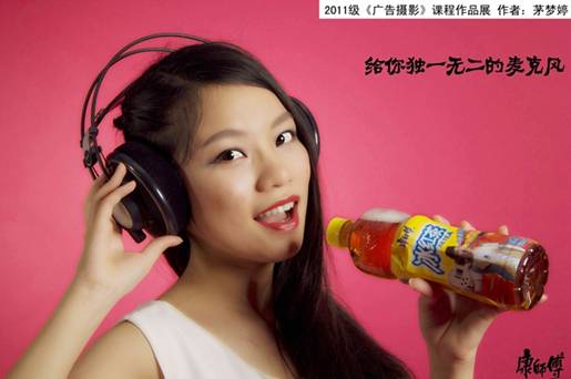 人像:首先确定了冰红茶作为拍摄对象,因为冰红茶广告的一贯基调是青春活力的,因此结合了摇滚和麦克风两个元素。拍摄主角的妆容、发型和耳机都在表达她是个爱音乐的女生。她手里的冰红茶就是她的麦克风。只要有梦想,只要有音乐,冰红茶就是你的麦克风。