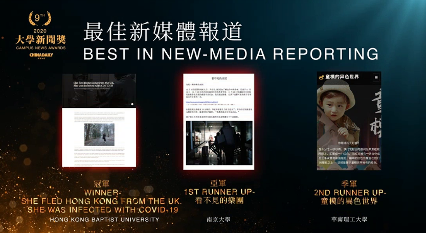 丁浸哲、李嘉豪与李远浩同学合作完成的新媒体报道《看不见的乐团》,以国际残疾人日为契机,关注学习生活在特殊教育学校的员工,通过对学校“感恩音乐会”举办前后的采写与拍摄,真实传递了特殊教育学校寻常而又不寻常的一天,获最佳新媒体报道组亚军。