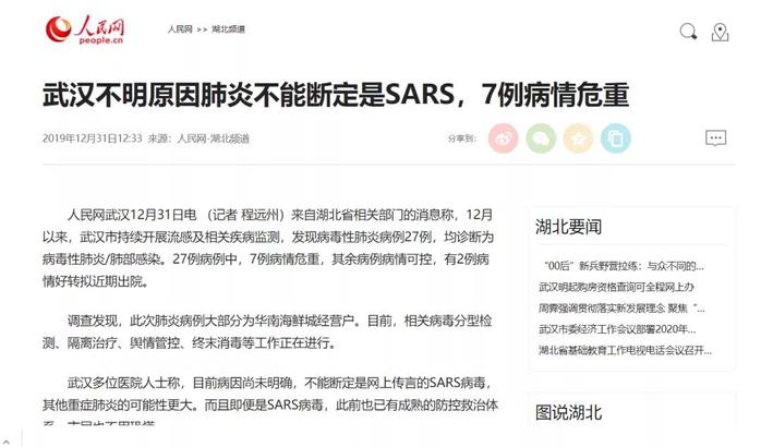 人民网 《武汉不明肺炎不能断定是SARS,7例病情危重》 报道截图