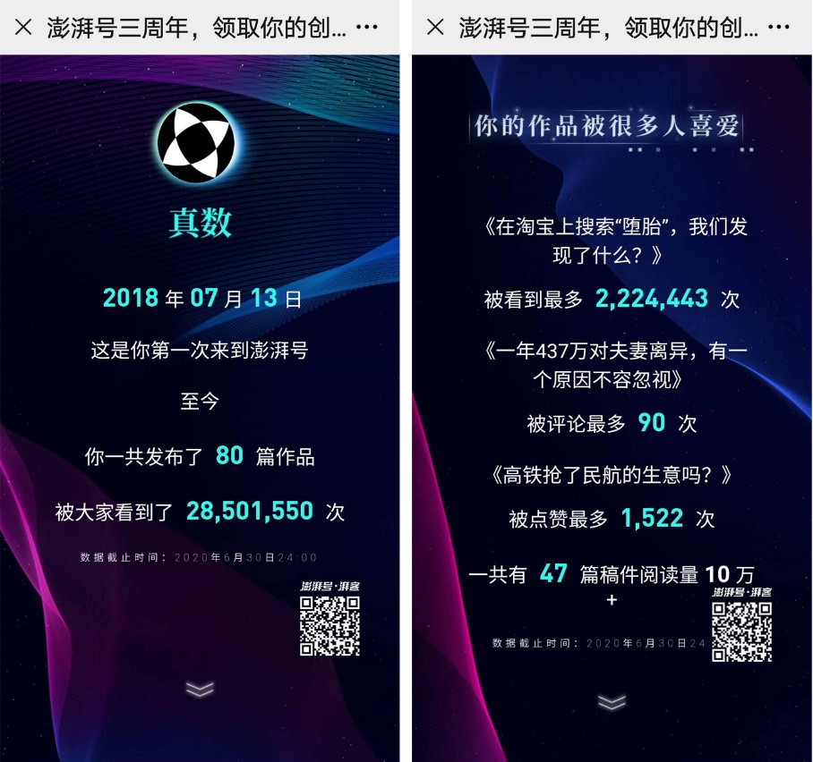 截至2020年8月,入驻“湃客”的机构/个人创作者超过2600个,共发布超过9.2万篇优质稿件,收获了逾162.5亿次的阅读量。