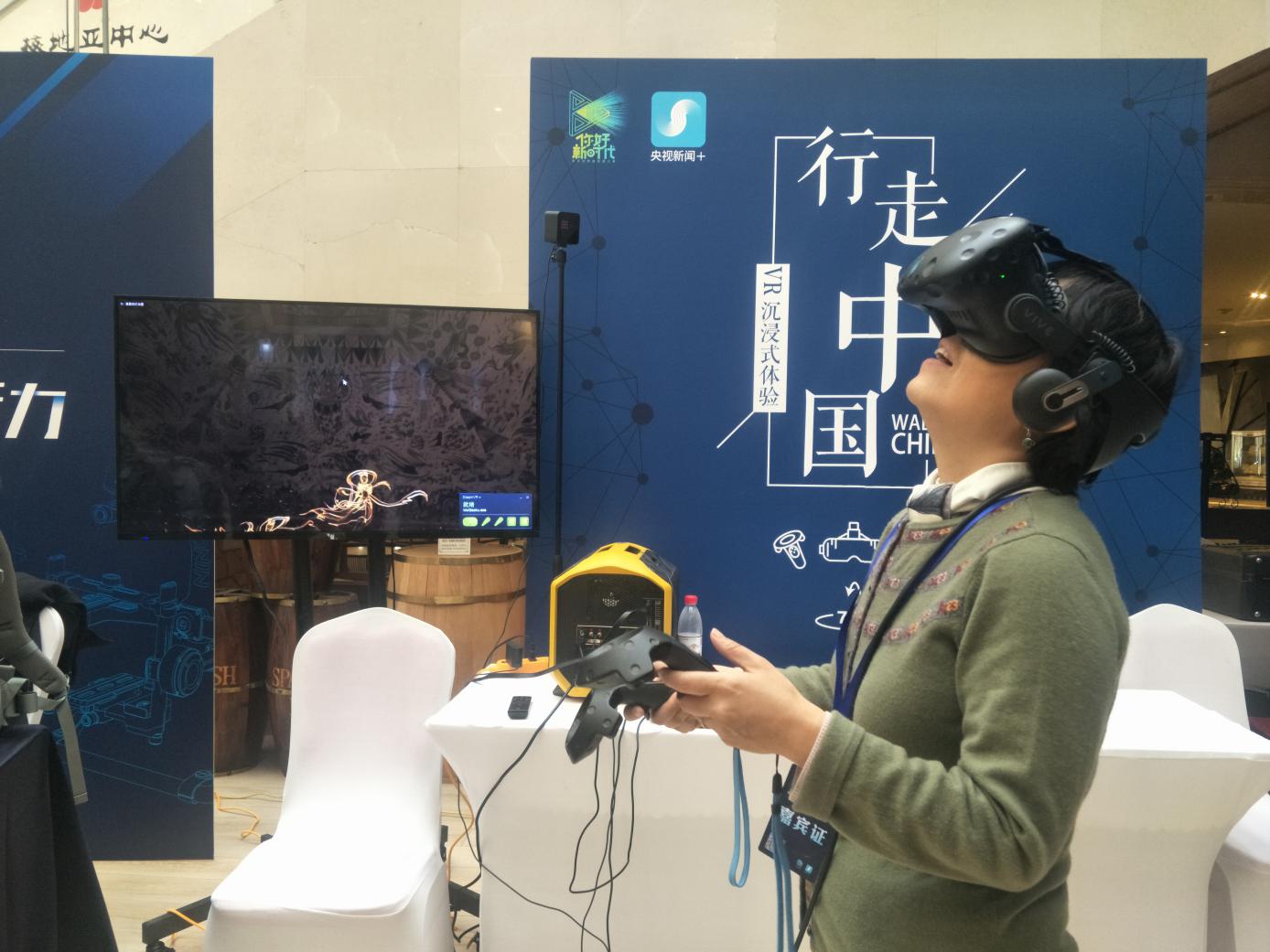 本届大赛评委、betway88西汉姆联国家级传媒实验教学示范中心主任白净教授在颁奖典礼现场体验VR作品《行走中国•敦煌》