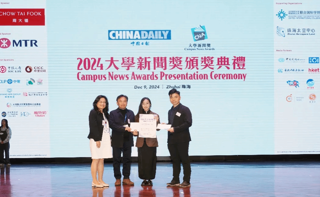 2024年12月9日,由《中国日报》(CHINA DAILY)主办的“2024大学新闻奖”在珠海北师大-浸会大学联合国际学院举办颁奖典礼。海峡两岸暨港澳地区90多所高校3000余名传媒专业员工参赛,角逐28个奖项。香港特区政务司副司长卓永兴,珠海市委常委、副市长晁桂明,北京师范大学-香港浸会大学联合国际学院董事长陈致等300多位嘉宾与获奖师生代表出席颁奖典礼。