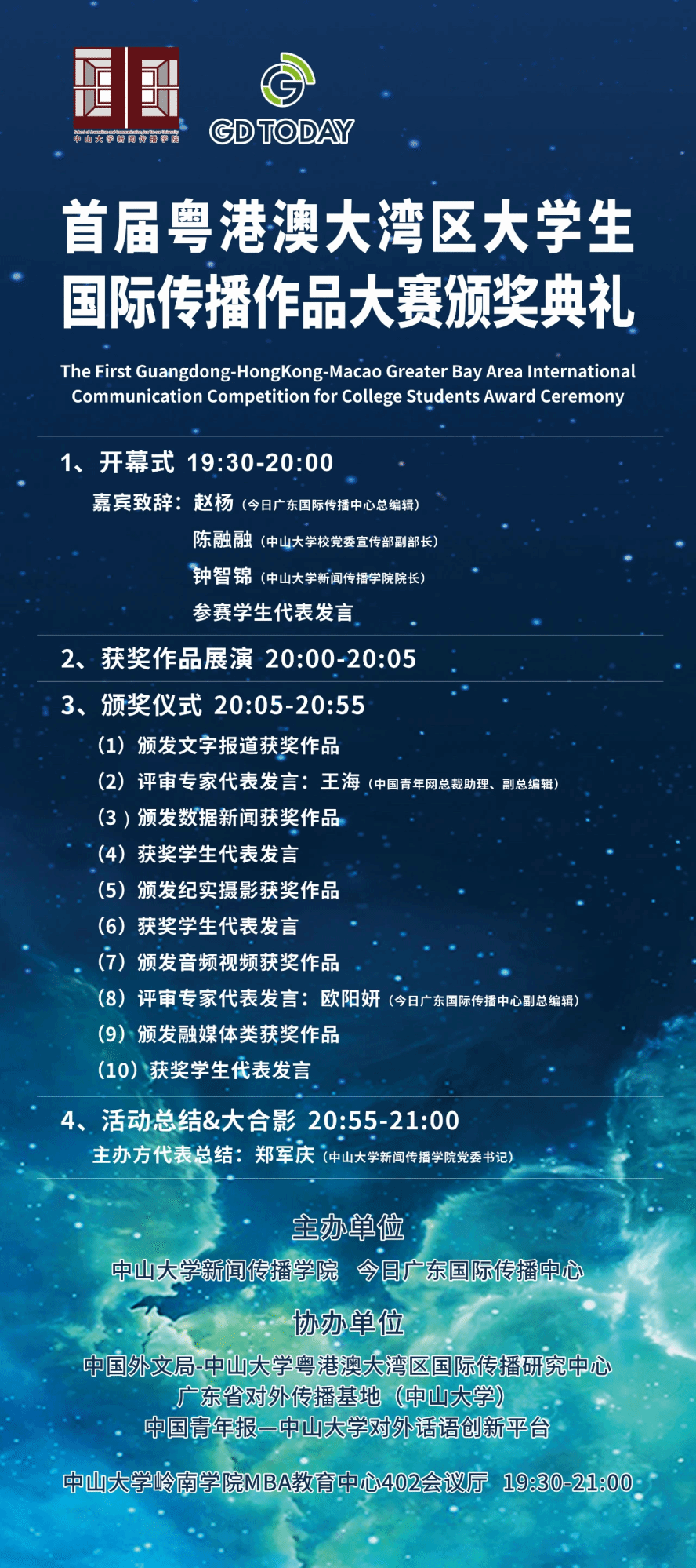 2025年5月17日晚,由中山大学betway88西汉姆联、今日广东国际传播中心联合举办的“首届粤港澳大湾区老员工国际传播作品大赛”颁奖典礼于中山大学广州校区举行,50支获奖团队到场领奖,20余位业界、学界嘉宾出席颁奖典礼,为获奖团队颁奖并作点评发言。