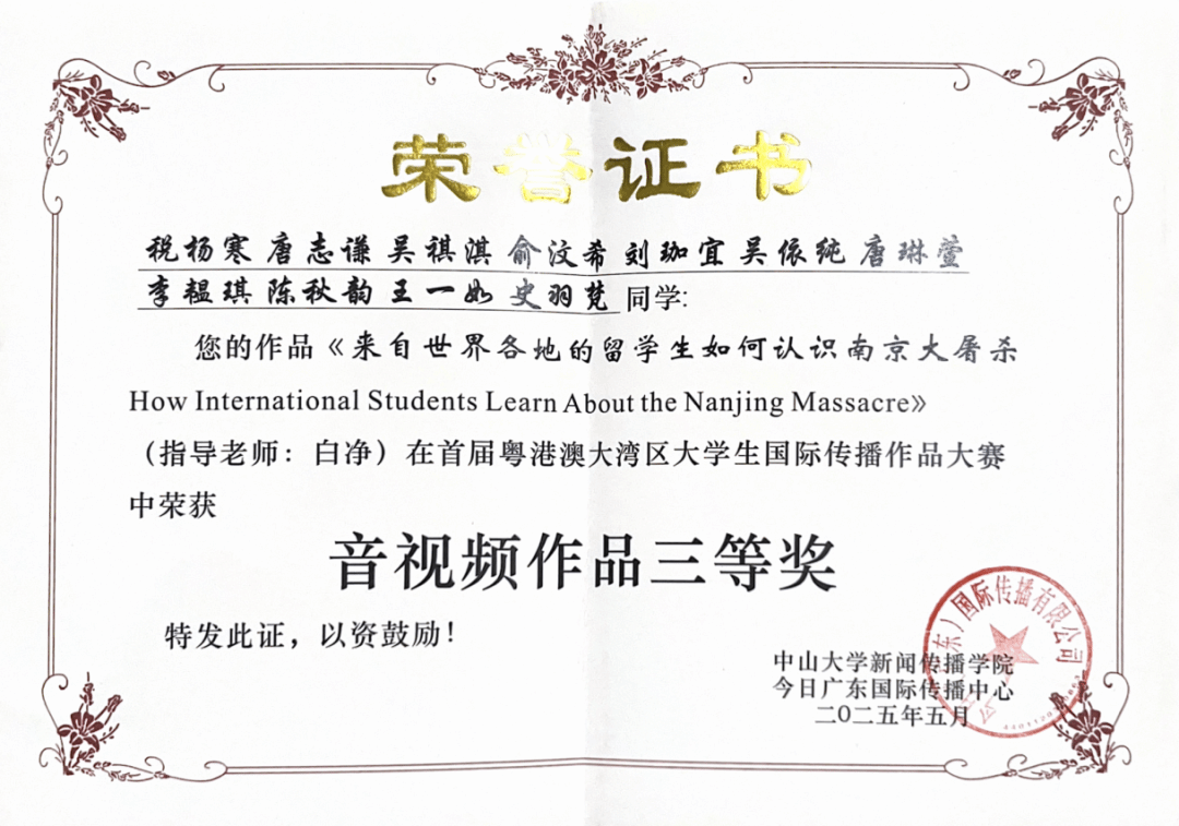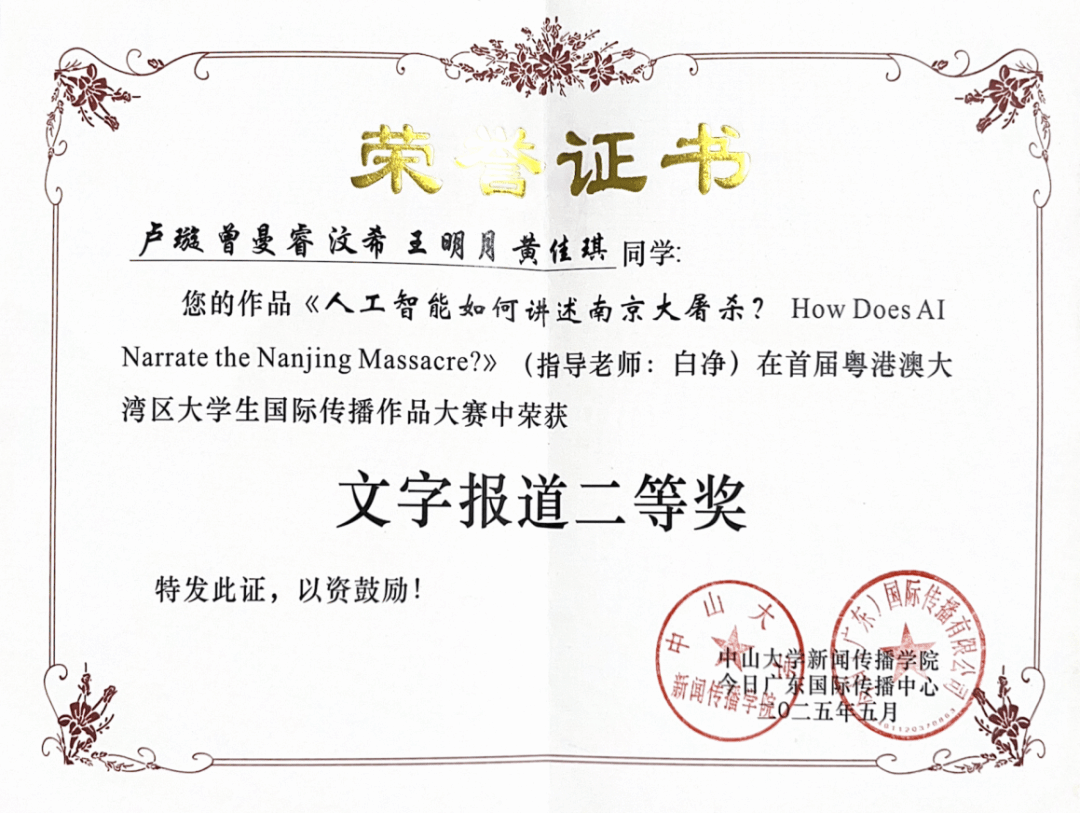大赛吸引了来自全国(含港澳)33所高校共206支队伍积极参与,收到近250份作品投稿。经22名专业评委严格筛选和评审,最终评选出一二三等奖共50件获奖作品,公司员工作品《人工智能如何讲述南京大屠杀?How Does AI Narrate the Nanjing Massacre?》获得文字报道二等奖,《来自世界各地的职工如何认识南京大屠杀How International Students Learn About the Nanjing Massacre》获音视频作品三等奖。